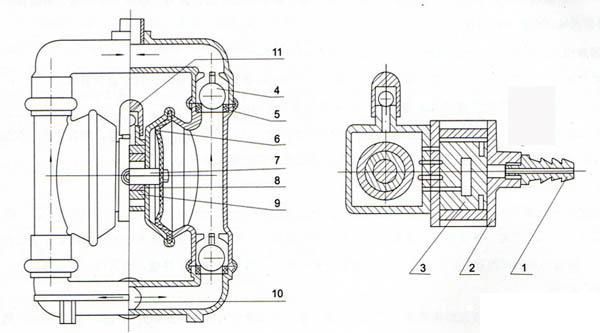 1.进气口 2.配气阀体 3.配气阀 4.圆球 5.球座 6.隔膜 7.连杆 8.连杆铜套 9.中间支架 10.泵进口 11.排气口