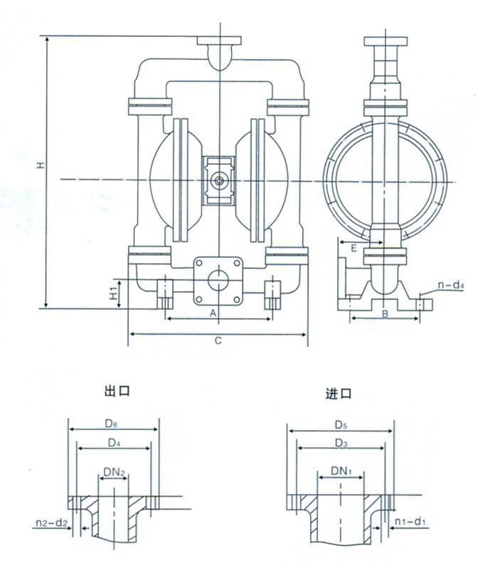 | A | B | D5 | D6 | C | H | H1 | DN1 | DN2 | n-d1 | n-d2 | D3 | D4 | E | n-d4 | 进气口 外径 | 备注 |