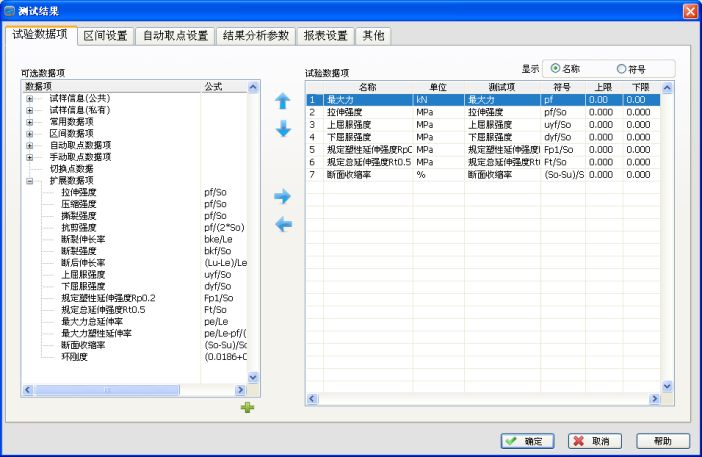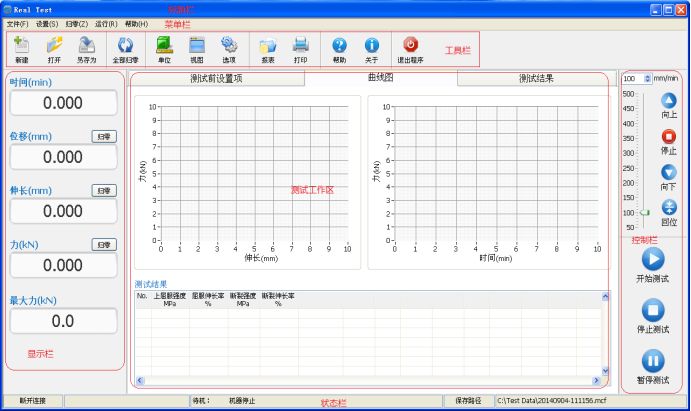 7.测试结束可自动存档、手动存档,测试完毕自动求算最大力量、上、下屈服强度、环法、逐步逼近法、非比例延伸强度、抗拉强度、抗压强度、任意点定伸长强度、定负荷延伸、弹性模量、延伸率、剥离区间最大值、最小值、平均值、净能量、总能量、弯曲模量、断点位移x%荷重、断点荷重X%位移、等等。备份:测试数据可保存在任意硬盘分区。