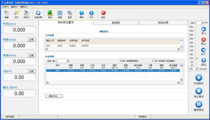 G. 测试结束可自动存档、手动存档,测试完毕自动求算最大力量、上、下屈服强度、环法、逐步逼近法、非比例延伸强度、抗拉强度、抗压强度、任意点定伸长强度、定负荷延伸、弹性模量、延伸率、剥离区间最大值、最小值、平均值净能量、总能量、弯曲模量、断点位移x%荷重、断点荷重X%位移、等等。备份:测试数据可保存在任意硬盘分区。。