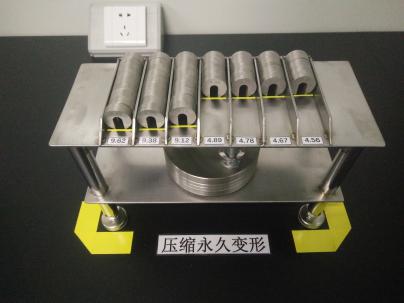 取标准试片,夹于本器平面板之间,以螺丝旋转,压缩至一定比率,再放进一定温度之烘箱中,经规定之时间后取出,拆下试片,冷却30分钟后,测其厚度,用公式计算其压缩歪度。