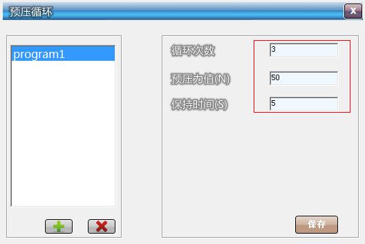 依次输入 次数,压力,保持时间即可,每次会自动执行如下步骤:1.上升到达 预压力值2.保持该力值 (保持时间)秒3.下降到达下限位4.完成当次循环
