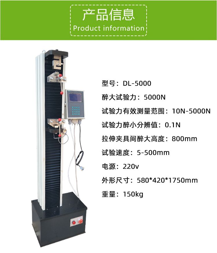 DL-5000拉力试验机,主要用于保温砂浆、外保温材料的拉伸、粘接强度等试验,具有力值延伸同时计数,设定力值停机【定力延伸】,设定延伸长度停机【定伸应力】,平均值显示及七个测试速度,高亮大屏显示器。可一次性显示出最大力值,材料强度,拉伸长度以及最大延伸率。不用操作人员再进行记录和分别计算,大大提高了试验的可靠性,是试验室和计量部门仲裁得心应手的试验仪器。