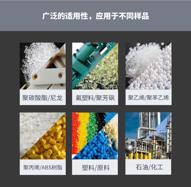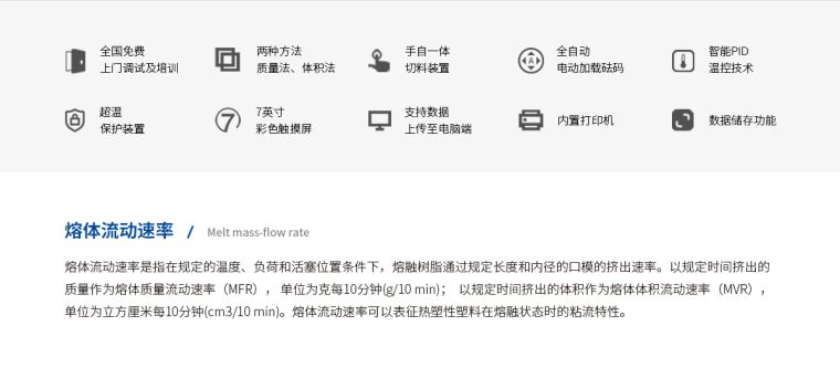 熔体流动速率仪,用于测定热塑性树脂的熔体质量流动速率(MFR)、熔体体积流动速率(MVR)和熔体密度,它不仅适用于熔融温度较高的聚碳酸酯、尼龙、氟塑料、聚芳砜等工程塑料,也适用于聚乙烯、聚苯乙烯、聚丙烯、ABS树脂、聚甲醛树脂等熔融温度较低的塑料测试,广泛地应用于塑料原料、制品、石油化工等行业以及相关大专院校、科研单位和商检部门。