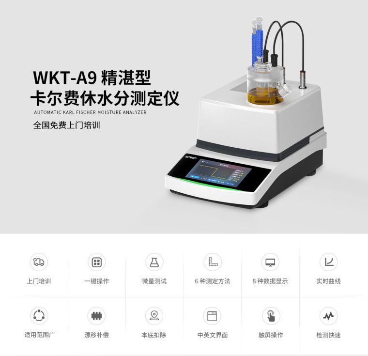 维科美拓WKT-A9精湛型卡尔费休微量水分测定仪利用的是卡尔费休库仑法(电量法)的原理去快速测定样品中的微量水分,测定水分低至0.001ppm,可以在1分钟内测定出固体、液体、粉体的微量水分,仪器自带打印功能,可以储存500组数据,可实时查询并打印!新创的导航式提醒及内置电子说明书,让仪器操作不再复杂,WKT-A9符合多项国家及国际水分测定标准,内置八种水分计算公式,6种测定方法能够适用各行业水分测定需要,广泛应用在化工、石油、医药、电力、食品、科研、检测等行业。