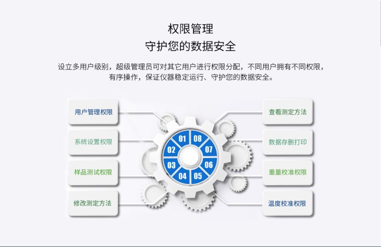 具有用户权限管理功能,符合GMP等管理规范,可对用户权限、仪器设置、仪器操作、数据删除、程序自定义、数据传输等功能进行权限管理,保证仪器稳定运行和数据安全。