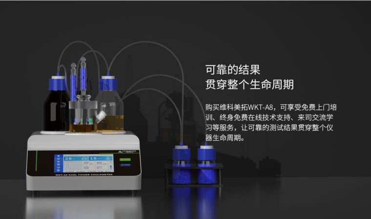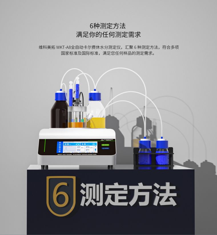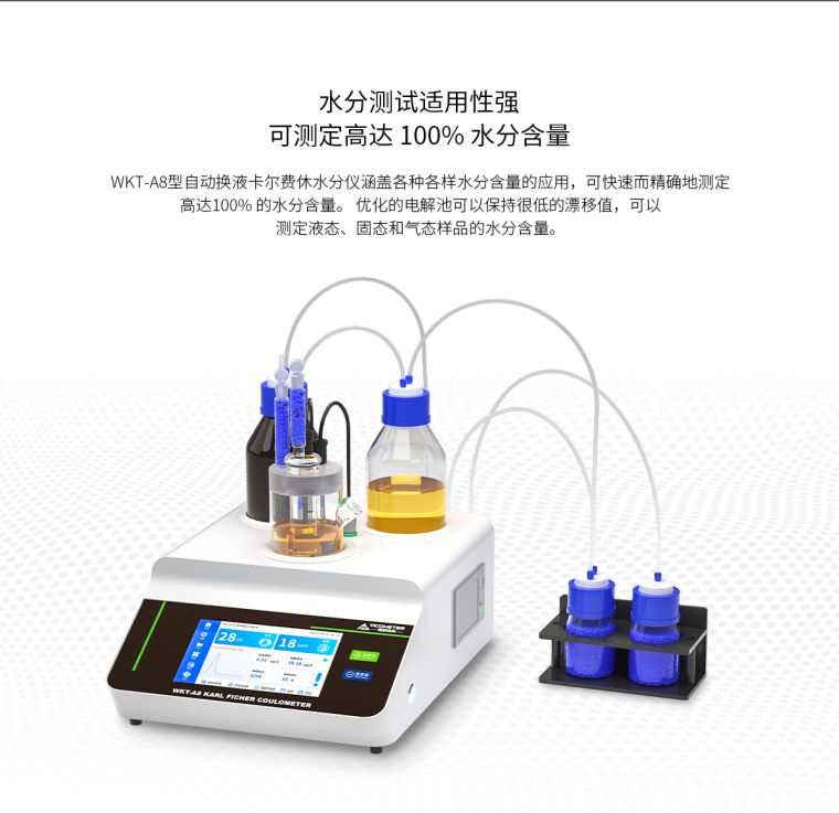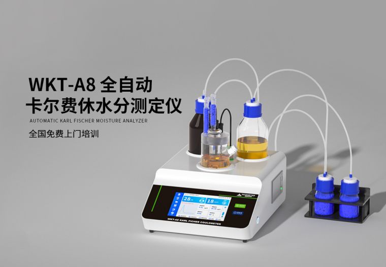 WKT-A8"全自动"卡尔费休微量水分测定仪利用的是卡尔费休库仑法(电量法)的原理去快速测定样品中的微量水分,测定水分低至1ppm(0.0001%),可以在1分钟内测定出固体、液体、粉体的微量水分,仪器自带打印功能,可以储存600组数据,可实时查询并打印!
