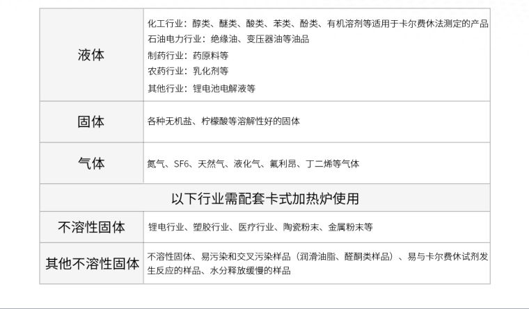 | 液体 | 化工行业:醇类、醚类、酸类、苯类、酚类、有机溶剂等适用于卡尔费休法测定的产品。 石油电力行业:绝缘油、变压器油等油品。 制药行业:药原料等。 农药行业:乳化剂等。 其他行业:锂电池电解液等。 |