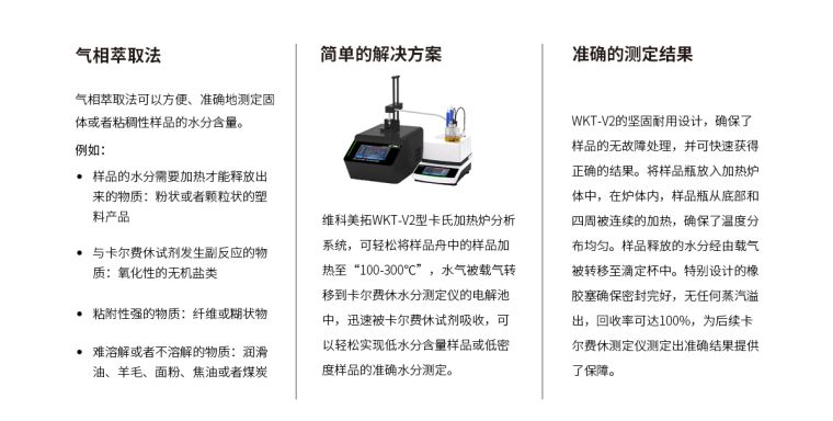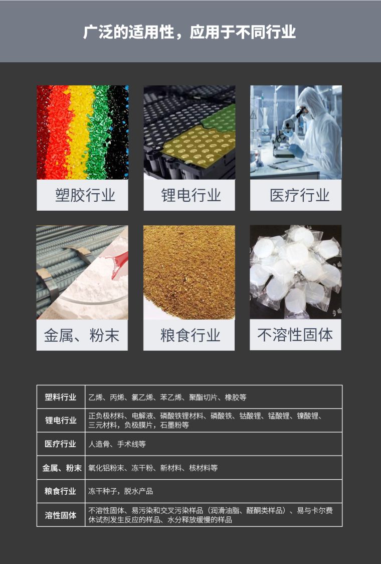 | 其他不溶性固体 | 不溶性固体、易污染和交叉污染样品(润滑油脂、醛酮类样品)、易与卡尔费休试剂发生反应的样品、水分释放缓慢的样品 |