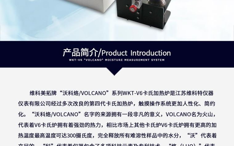 沃科烙/volcano名字的来源拥有一段非凡的意义,volcano名为火山,代表着V6卡式炉拥有着强劲的热力,相比市场上其他卡式炉V6卡式炉拥有更高的加热温度最高温度可达300摄氏度,完全释放所有难溶性样品中的水分,沃代表着充足的,科代表着仪器包含了多项科技元素及技术,烙(luo)代表着火山的热力,沃科烙/volcano是维科美拓人对卡式加热炉加热稳定、效率、高温的执着追求的体现!对不同样品的测定需求。