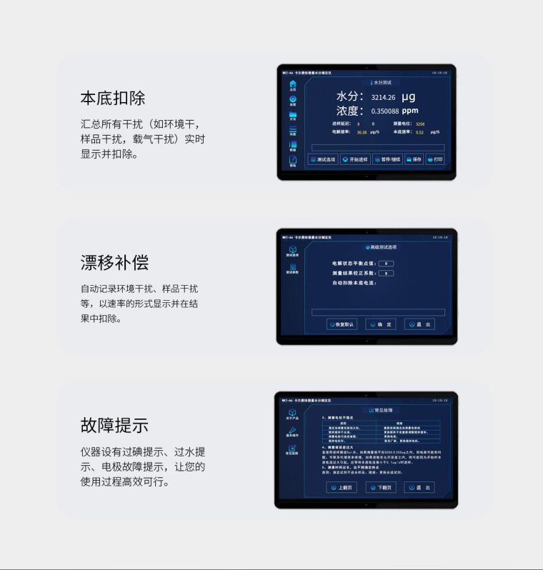 | 特殊功能 | 自动漂移补偿、环境及本底水分自动扣除、选配电脑工作站、故障自检提示 |