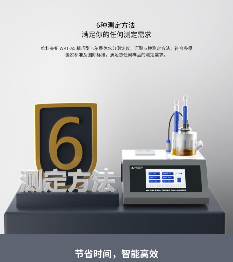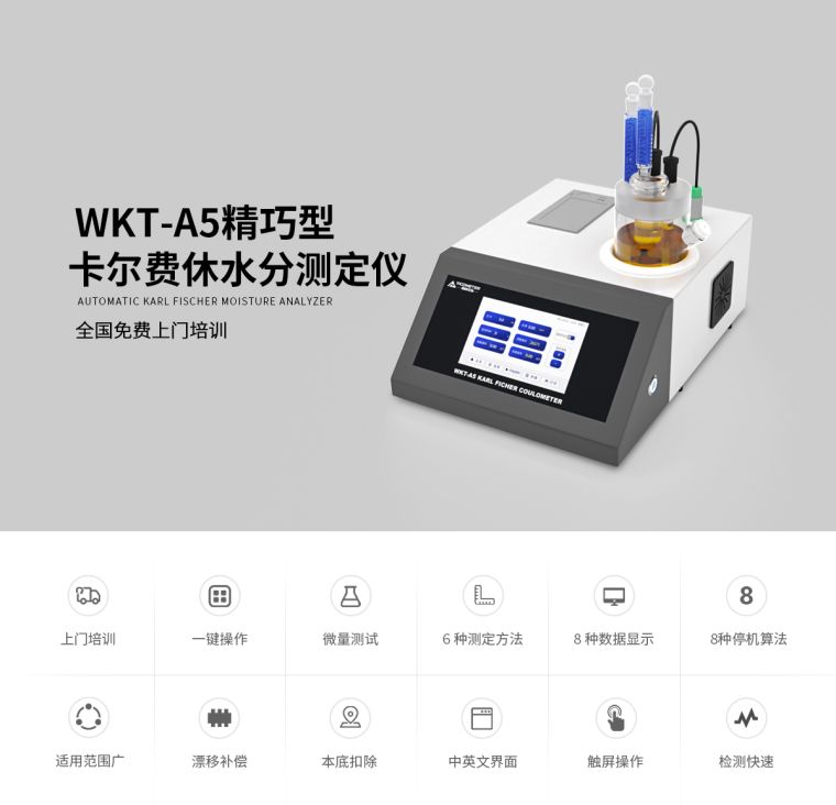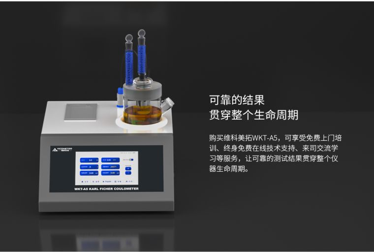 维科美拓WKT-A5智能型微量水分测定仪集成了多项的先进生产技术,测定原理为世界公认的测水经典方法【卡尔—费休库仑法】,测定范围低至0.0001%(1ppm),可在60秒内快速测定出液体、固体、气体中的水分含量,广泛应用在化工、石油、电力、科研、铁路等行业。在化工、石油、电力、科研、铁路等行业。