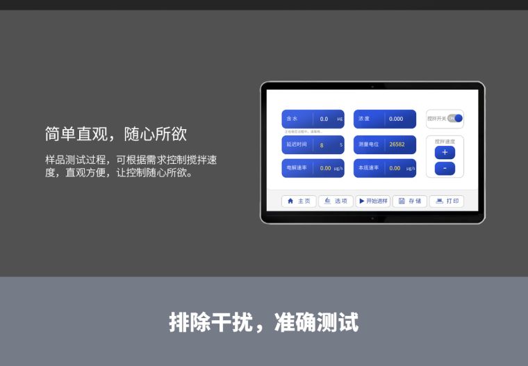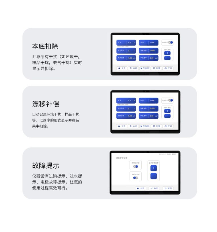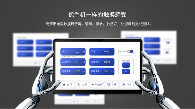 2. 中英文触摸液晶屏显示,测量电极数据直接A/D采样转换,采用先进的单片机控制,智能分析测定,适时显示仪器工作状态;
