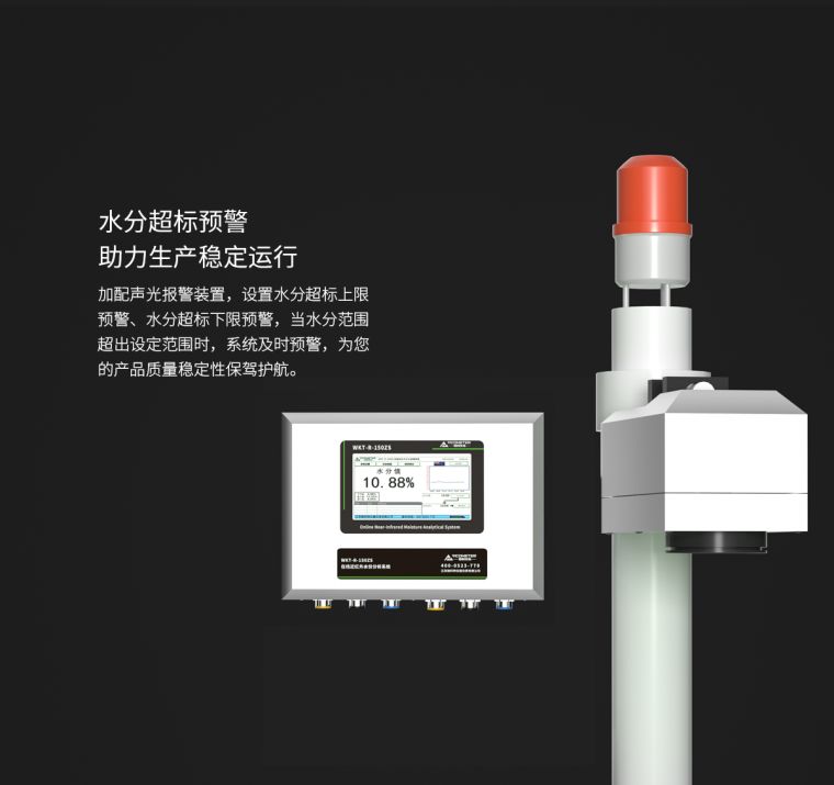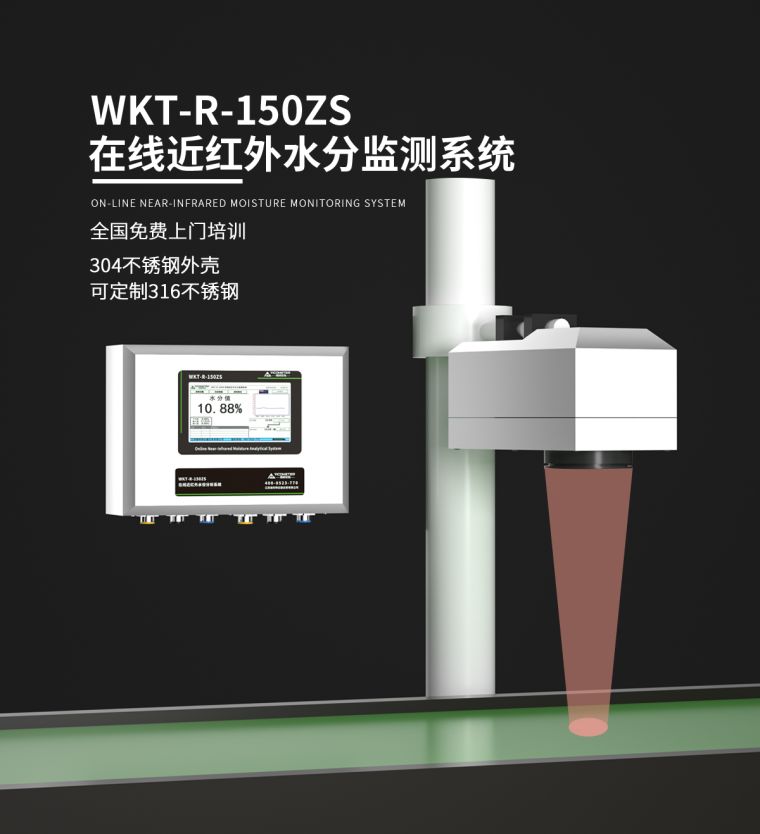 维科美拓WKT-R-150ZS-SS型不锈钢近红外在线水分测定仪用于一切需要快速测定水分的行业,可对化工原料、粮食谷物、木工木屑等原料进行在线检测。近红外光谱分析是指利用近红外光谱谱区包含的物质信息用于有机物质定性和定量分析的一种分析技术。仪器发出特定波长的光经过透镜、滤光盘、反射镜后将平行光反射到被测样品物料上,其中部分红外光呗样品吸收,另外一部分红外光散射后经过凹面镜聚集到近红外传感器中,传感器的内部数字处理器将光信号的参比光和测量光经过数字处理器处理后传送给仪器主机,主机即可快速显示被测物的水分范围。