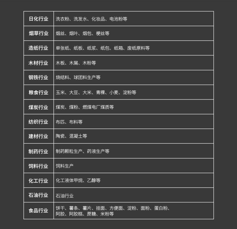 | 食品行业 | 饼干、薯条、薯片、挂面、方便面、淀粉、面粉、蛋白粉、阿胶、阿胶糕、蔗糖、米粉等 |