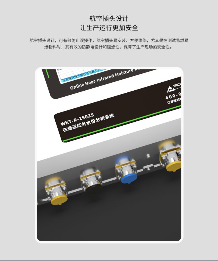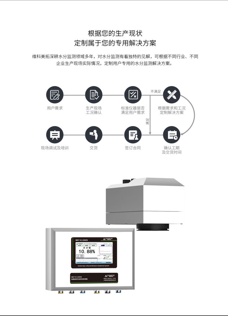 产品概述维科美拓WKT-R-150ZS-SS型不锈钢近红外在线水分测定仪用于一切需要快速测定水分的行业,可对化工原料、粮食谷物、木工木屑等原料进行在线检测。近红外光谱分析是指利用近红外光谱谱区包含的物质信息用于有机物质定性和定量分析的一种分析技术。仪器发出特定波长的光经过透镜、滤光盘、反射镜后将平行光反射到被测样