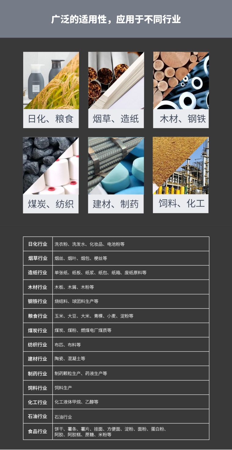 | 食品行业 | 饼干、薯条、薯片、挂面、方便面、淀粉、面粉、蛋白粉、阿胶、阿胶糕、蔗糖、米粉等 |