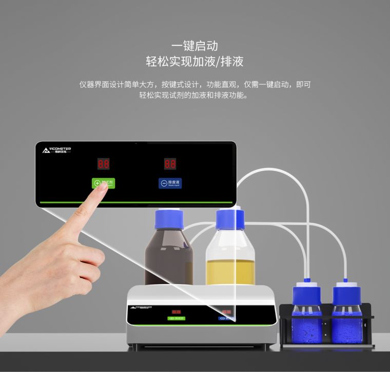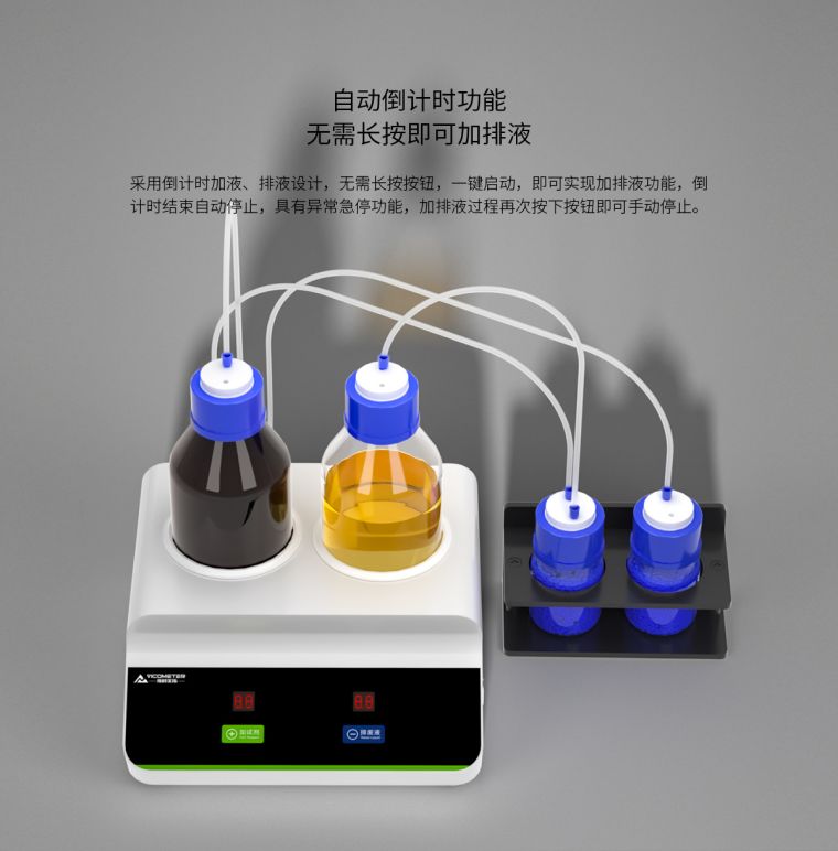 WKT-AHY02自动换液装置是维科美拓推出的一款与卡尔费休微量水分仪配套使用的新型换液器,内置加/排液泵,采用自动泄气三通阀设计,具有加排液倒计时和防回液功能。仪器设计精巧、结构紧凑、简单直观。按键式设计,一键直达,仅需一键启动,即可实现液体试剂的自动管理,试验人员无需与试剂接触,即可完成换液工作,是测定水分过程的溶剂管理好帮手。