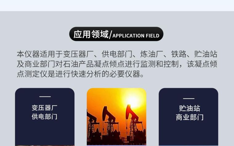 本仪器适用于变压器厂、供电部门、炼油厂、铁路、贮油站及商业部门对石油产品凝点倾点进行监测和控制,该凝点倾点测定仪是进行快速分析的必要仪器。测量结果符合GB510-83方法规范。