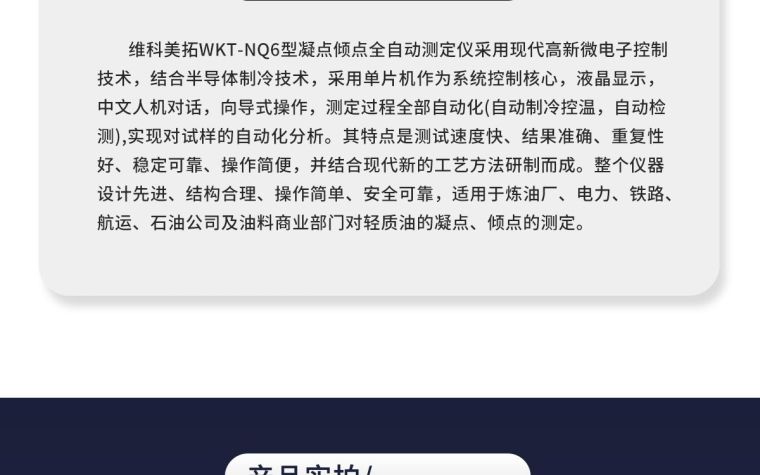一、产品概述 WKT-NQ6型凝点倾点全自动测定仪采用现代高新微电子控制技术,结合半导体制冷技术,采用单片机作为系统控制核心,液晶显示,中文人机对话,向导式操作,测定过程全部自动化