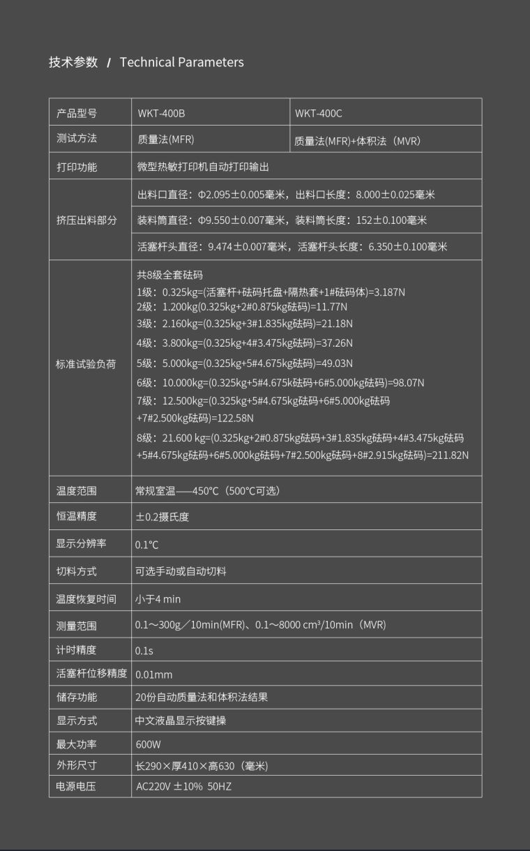 WKT-400系列熔体流动速率仪是按照《GB/T 3682-2000 热塑性塑料熔体质量流动速率和熔体体积流动速率的测定》、《ISO 1133-2005 Plastics-Determination of the melt mass-flow rate(MFR) and the melt volume-flow rate(MVR)》等标准设计制造的用于测定热塑性塑料熔体流动速率的仪器。