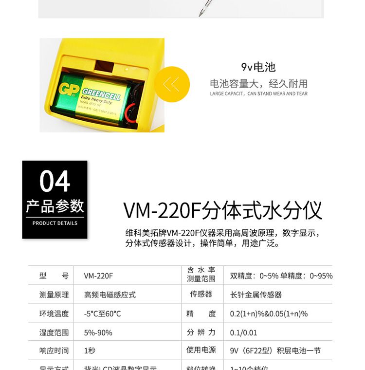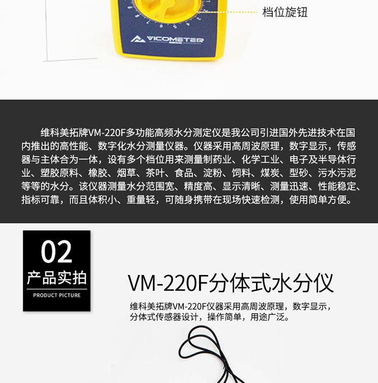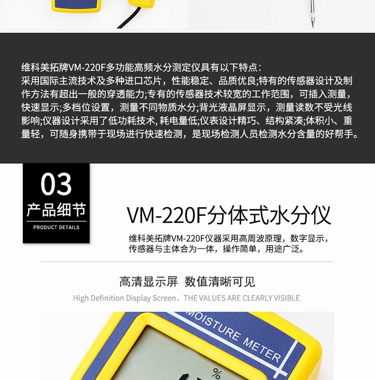 维科美拓牌 VM-220F多功能高频水分测定仪 是我公司引进国外先进技术在国内推出的高性能、数字化水分测量仪器。仪器采用高周波原理,数字显示,传感器与主体合为一体,设有多个档位用来测