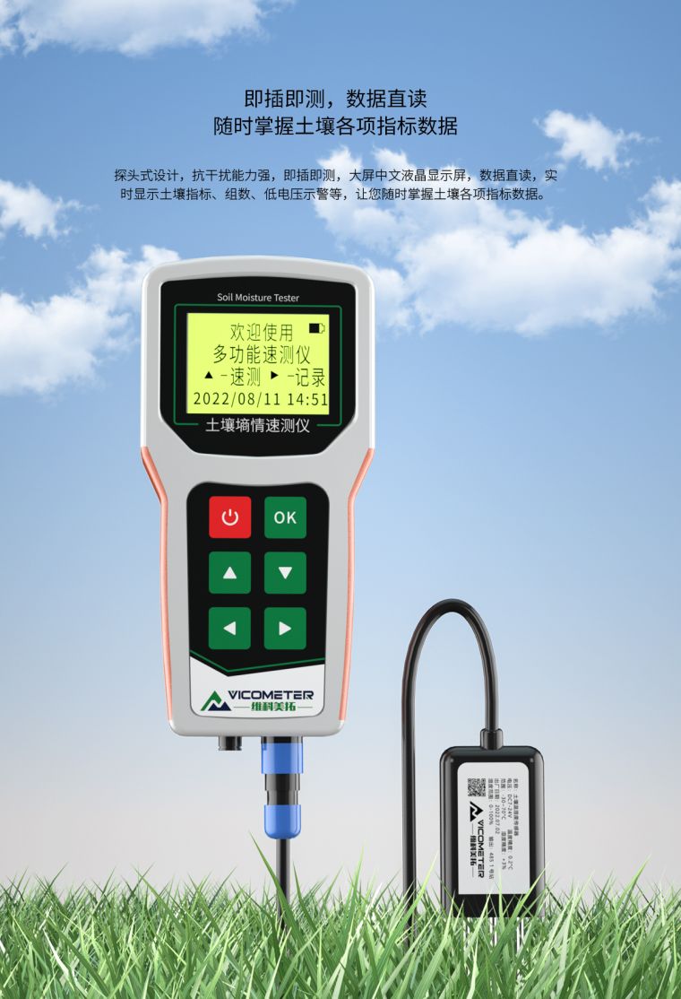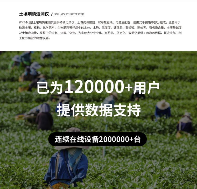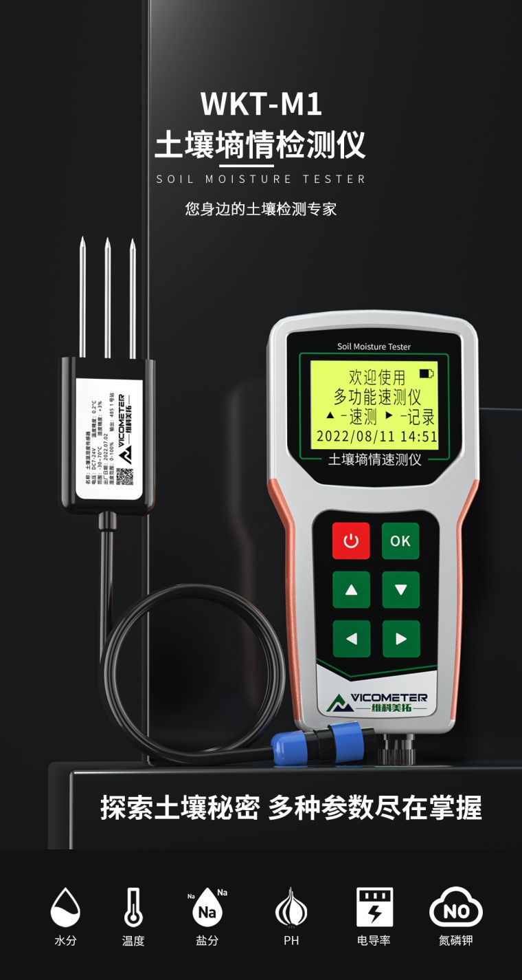 WKT-M1型土壤墒情速测仪由手持式记录仪、土壤类传感器、USB数据线、电源适配器、便携式手提箱等部分组成。主要用于检测土壤、植株、化学肥料、生物肥料等样品中的水分、水势、温湿度、速效氮、有效磷、速效钾、有机质含量,土壤酸碱度及土壤含盐量,植株中的全氮、全磷、全钾。为实现农业专业化、系统化、信息化、数据化提供了可靠的依据,是农业部门测土配方施肥的必选仪器。