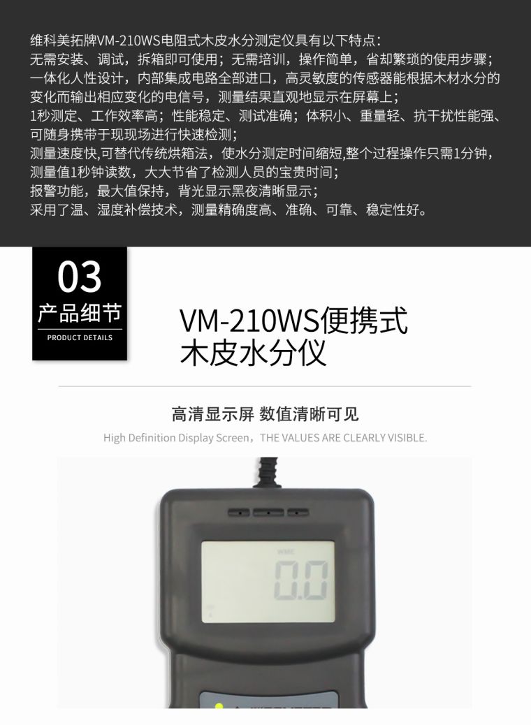 维科美拓VM-210W插针式木材水分测定仪引进美国先进技术研发生产而成,性能高、稳定性强,该仪器采用高频电磁波感应原理,数字显示,一体化设计,并设有9个档位用来测量不同树种的水分含量。该仪器测量精度高,适用范围广,体积小,重量轻,是现场检测,快速测量水分的理想选择。是木材行业在生产和检测过程中的好帮手。主要用来测量木制品的含水率,被广大的木业界用户用来测量以下产品水分含量:木材、家具、地板、木门、木托盘、实木地板、复合地板、竹地板、木木棒、木板、原木、板材、红木、木制品、包装箱、砧板、胶合板、木粉、人造板、竹材、木料、密度板、纤维板、木方、木箱、木器、木头、木柄、竹板等150余种国内外木材的水分含量。该仪器采用先进的美国集成电路传感技术和国际先进的电子元器件研制而成,测量精确度高,性能稳定,是家具、木制品等行业检测其产品水分含量的理想选择。