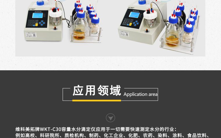 维科美拓 WKT-C30容量水分滴定仪采用用经典的卡尔费休测水原理及库仑滴定原理, 具有丰富的运算功能,对应每一个分析方法的计算公式已经预设在仪器中,无需人工计算, 直接显示样品的百
