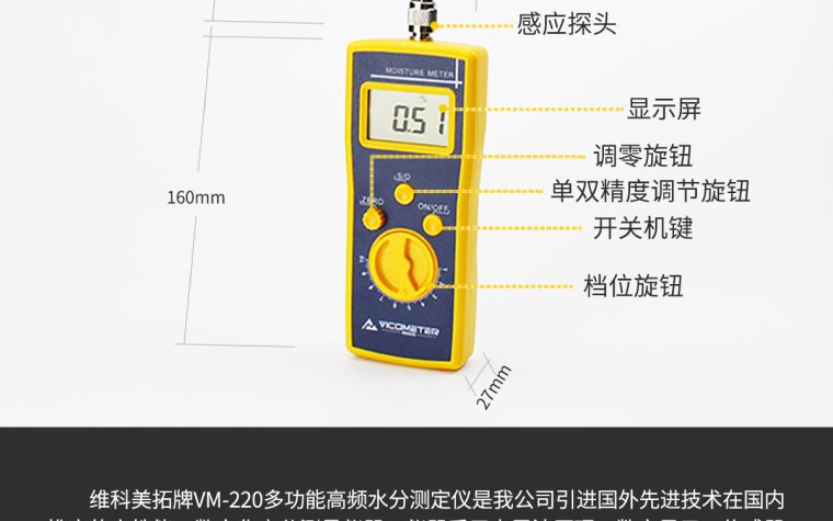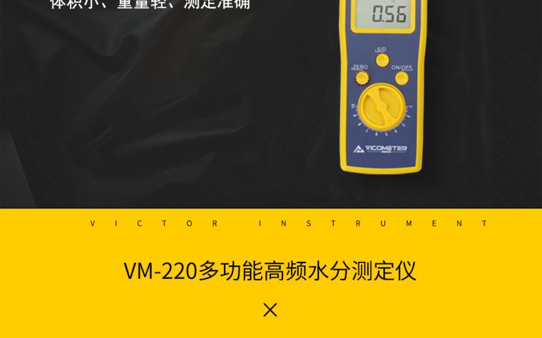 维科美拓牌VM-220多功能高频水分测定仪采用高周波原理,数字显示,传感器与主体合为一体,设有多个档位用于不同含水率样品的水分测定