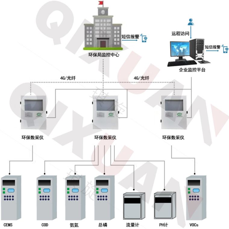 五、环保在线监测预警系统:现场站房配套安装数据采集终端,采集CEMS烟气流速、温度、压力及烟尘、氮氧化物、二氧化硫、含氧量数据和进、出水口站房的污水流量、PH、COD、氨氮数据,然后将所采集到的原始数据与计算的各项参数数据通过无线移动专网发送到环保监控中心,从而实现对企业现场烟气排放和排污的实时监管。