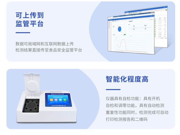 仪器带有监管平台,数据可局域网和互联网数据上传,检测结果直接传至食品安全监管平台。进行区域食品安全监管及大数据分析处理与数据统计,检测区域食品安全长短期动态,达到食品安全问题预估、预警 。