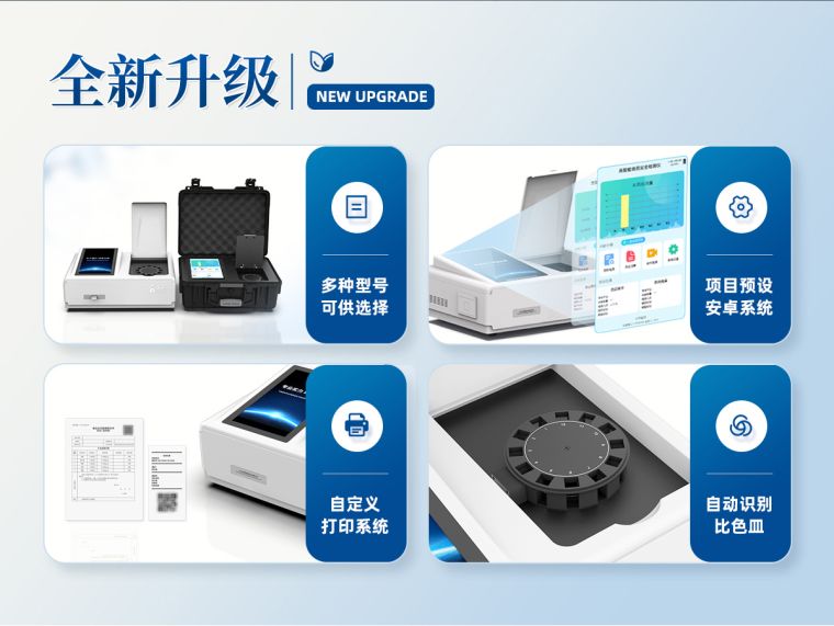 仪器采用台式一体化系统检测技术,将分光光度模块、胶体金检测模块、新型农残检测模块、数字化管理模块、无线通讯模块高度集成于一体,支持检测200种食品安全检测项目,同时预留升级检测方法。