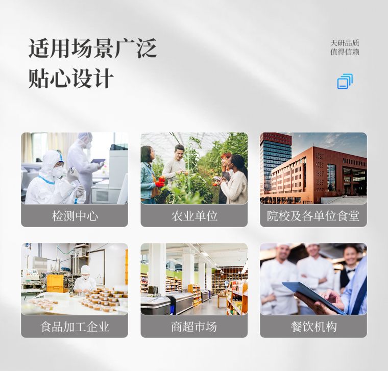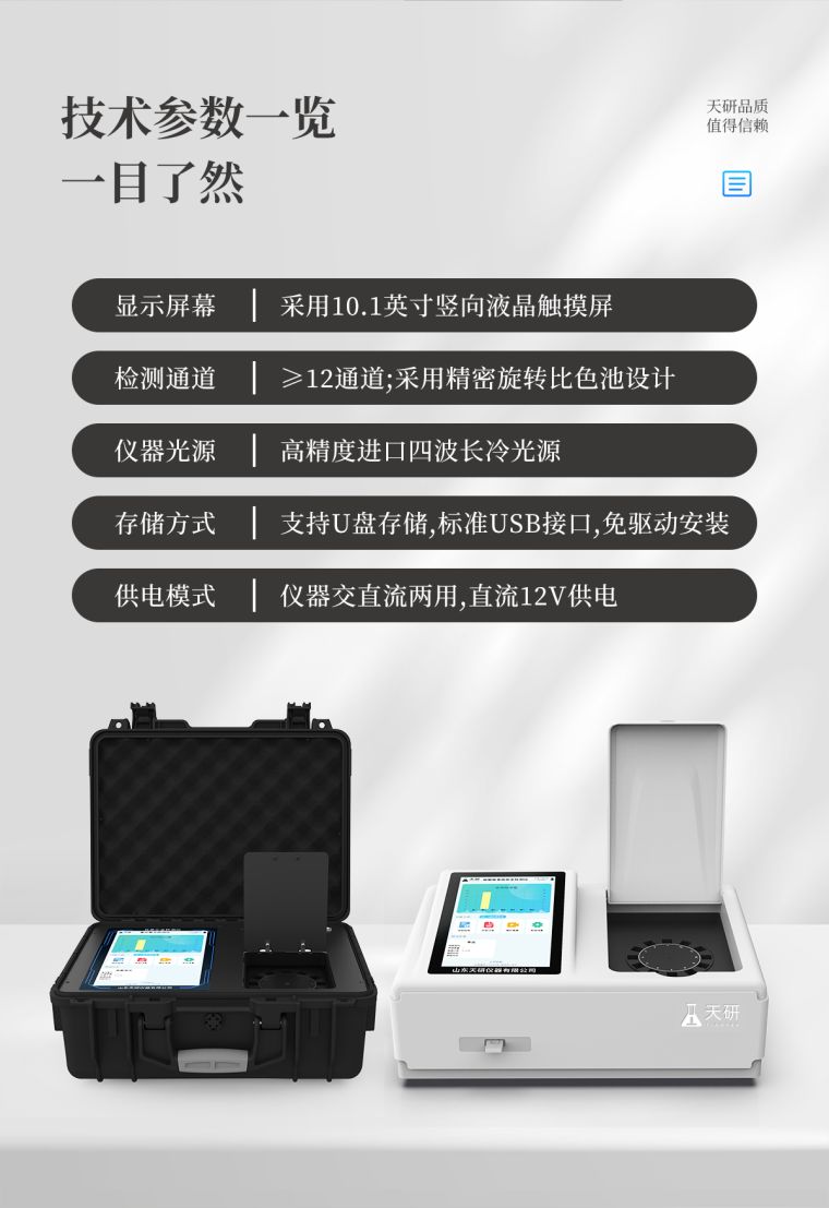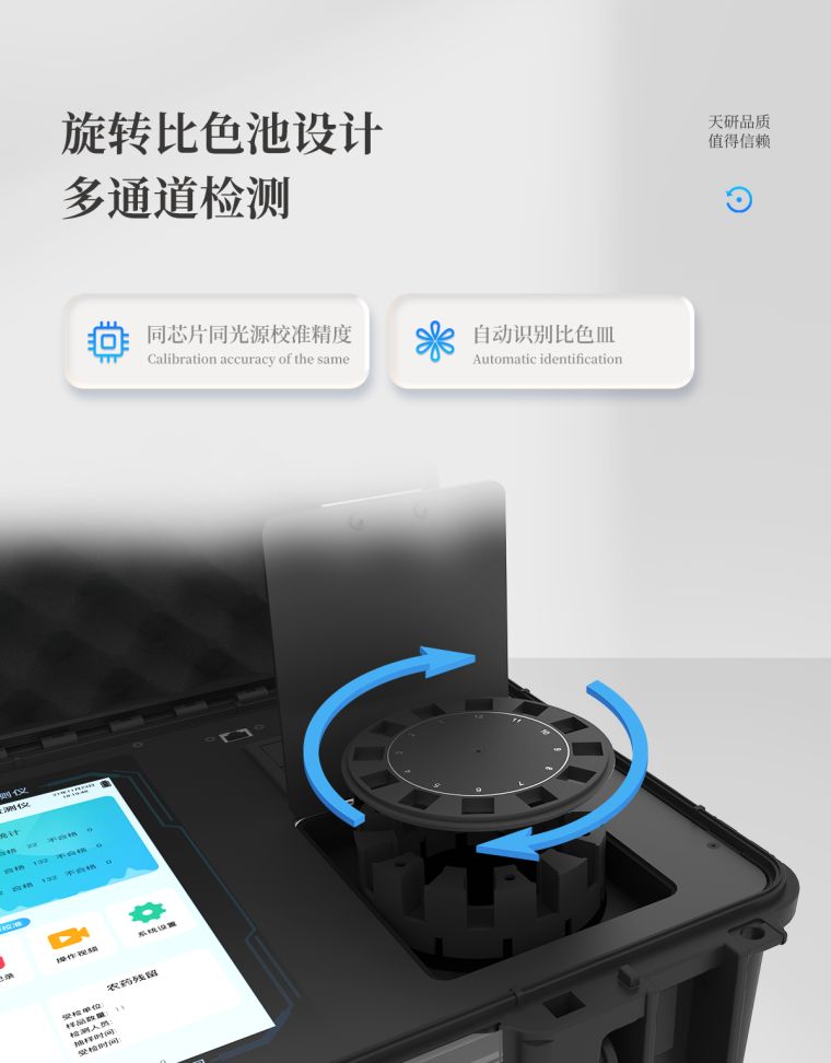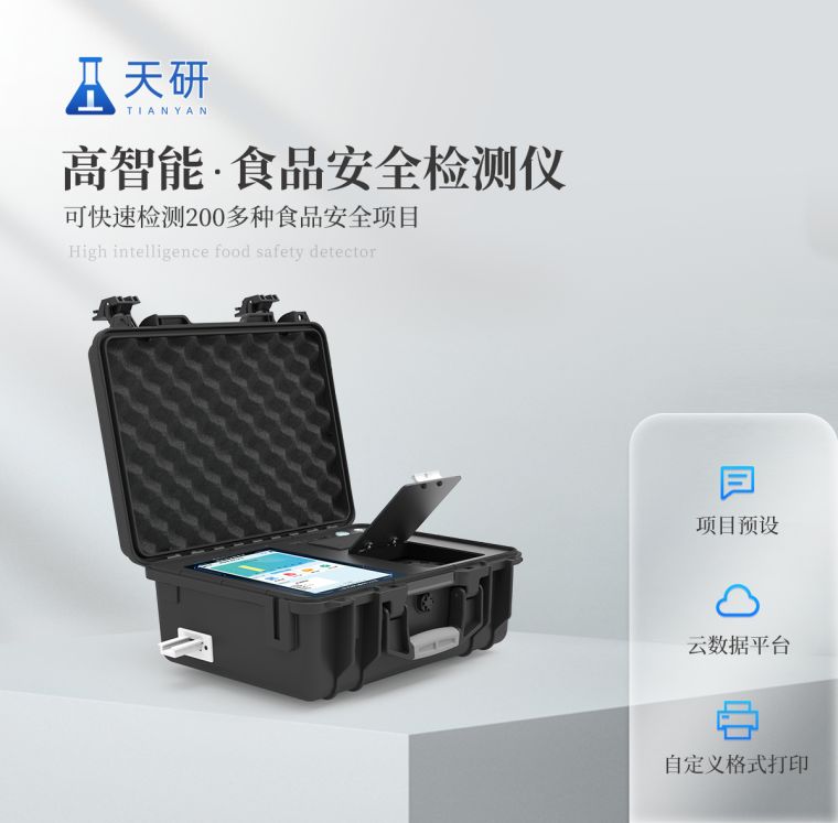 仪器采用手提一体化系统检测技术,将分光光度模块、胶体金检测模块、新型农残检测模块、数字化管理模块、无线通讯模块高度集成于一体,支持检测200种食品安全检测项目,同时预留升级检测方法。