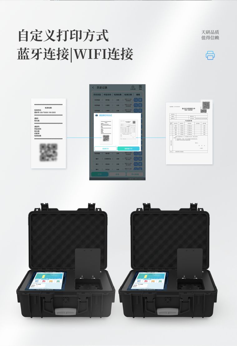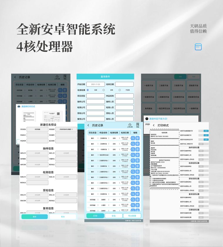 ★打印系统:内置全新打印机,新创自定义打印方式,可按需灵活勾选控制:产品合格证(国家农业部标准要求),二维码,抽样信息、检测信息,受检信息、复核信息、抽样日期、检测日期等信息的打印。