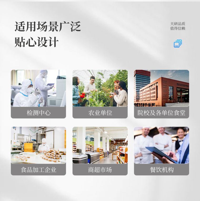 多功能食品安全检测仪可快速检测200多项目,包含非食用化学物质、滥用食品添加剂、农药残留、兽药残留、重金属、病害肉、营养强化剂、抗生素类残留、激素类残留、真菌毒素类残留、化学类残留等现场的定性定量检测。该多功能食品安全检测仪为集成化食品安全快速检测分析设备,广泛应用于市场监管局、检测中心、卫生监督部门、农业部门、院校及各单位食堂、食品肉产品深加工企业、商超市场、司法部门、餐饮机构、养殖场、屠宰场、检验检疫部门等单位使用。