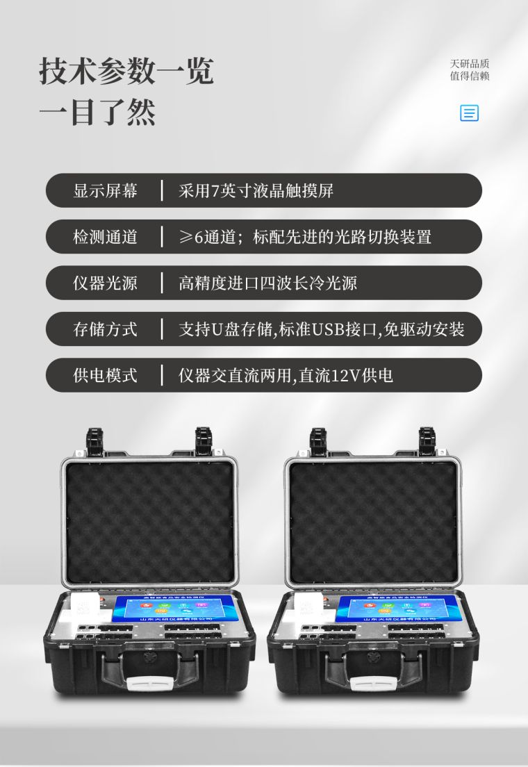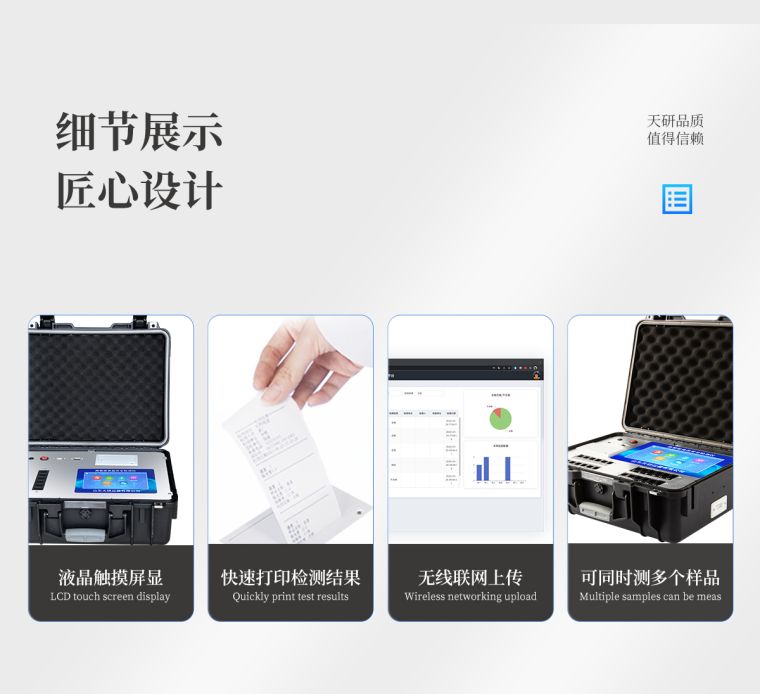 一体化便携式快检设备,满足现场及流动检测使用需求,能够在同一软件下实现所有检测项目的检测,并可通过同一窗口直观显示检测结果。