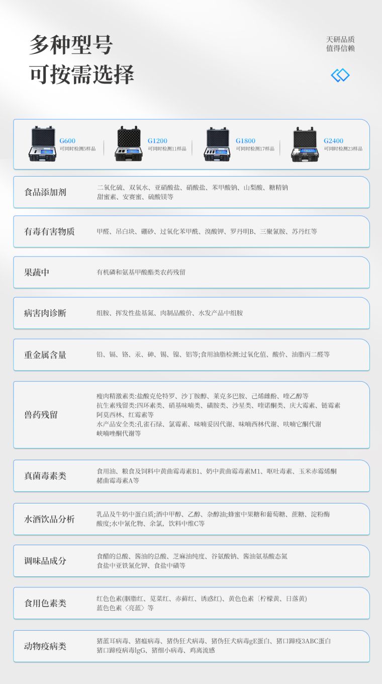 多功能食品安全检测仪可快速检测200多项目,包含非食用化学物质、滥用食品添加剂、农药残留、兽药残留、重金属、病害肉、营养强化剂、抗生素类残留、激素类残留、真菌毒素类残留、化学类残留等现场的定性定量检测。该多功能食品安全检测仪为集成化食品安全快速检测分析设备,广泛应用于市场监管局、检测中心、卫生监督部门、农业部门、院校及各单位食堂、食品肉产品深加工企业、商超市场、司法部门、餐饮机构、养殖场、屠宰场、检验检疫部门等单位使用。
