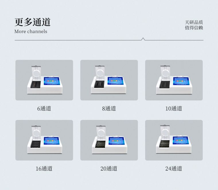 检测通道:24个检测通道,可以同时测试多个样品,循环检测,即放即检,每个样品由程序控制分别独立工作,不会互相干扰。
