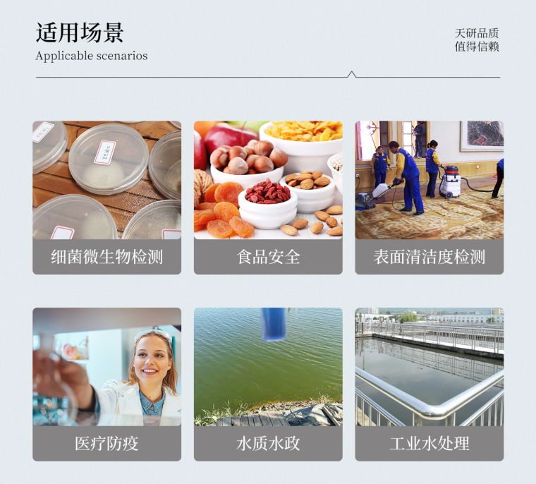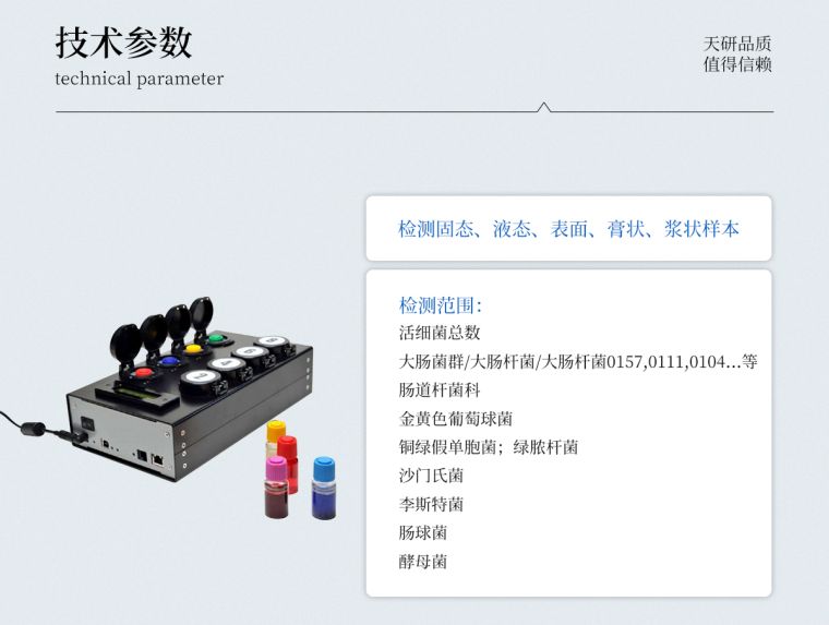 可实现活菌总数、嗜常温菌总数(22℃)、嗜常温菌总数(30℃)、大肠杆菌O157:H7、大肠菌群、沙门氏菌、单核增生李斯特菌、金黄色葡萄球菌、阪崎肠杆菌、肠球菌、乳杆菌、酵母菌、真菌、副溶血性弧菌等微生物快速检测;