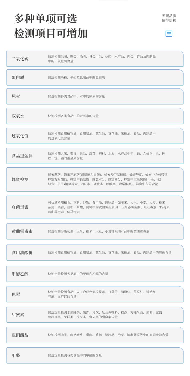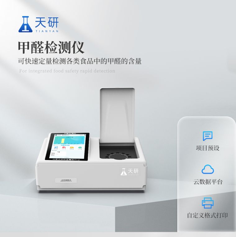 可快速定量检测各类食品中的甲醛的含量,仪器预留其他项目检测程序和端口,根据日后需求可方便的自主增加检测项目。日后可升级为检测,水产品,肉制品,面制品的综合类型仪器。