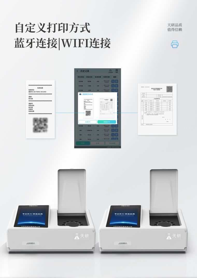 自定义打印系统:内置全新打印系统,新创自定义打印方式,可按需灵活设置开启或关闭:产品合格证(国家农业部标准要求),二维码,抽样信息、检测信息,受检信息、复核信息、抽样日期、检测日期等信息的打印。