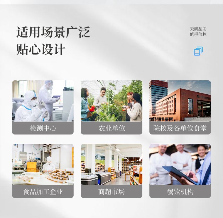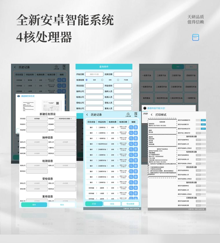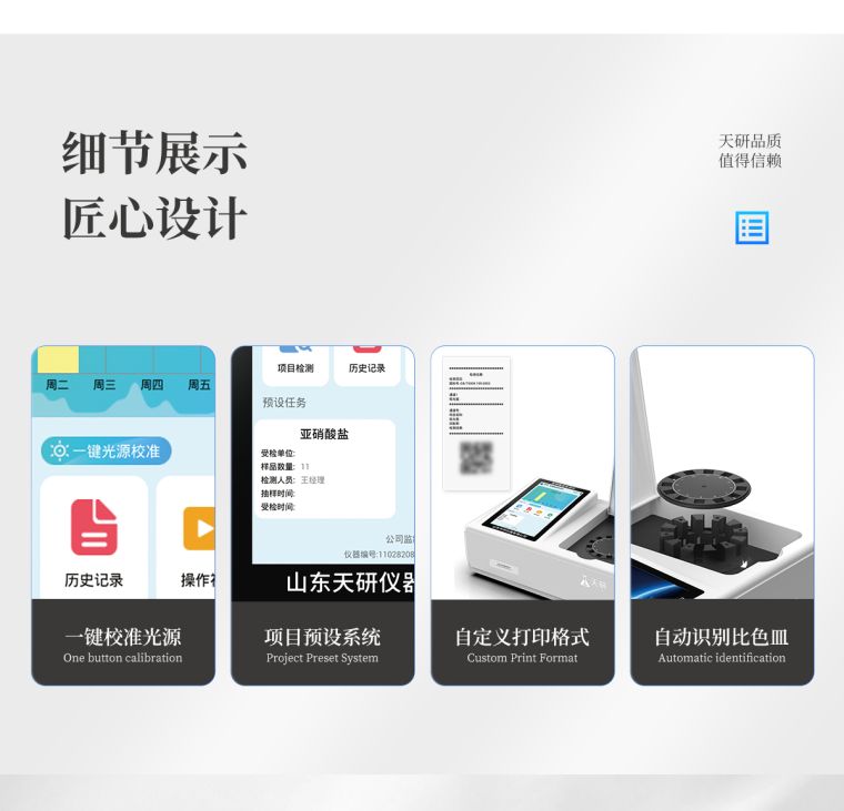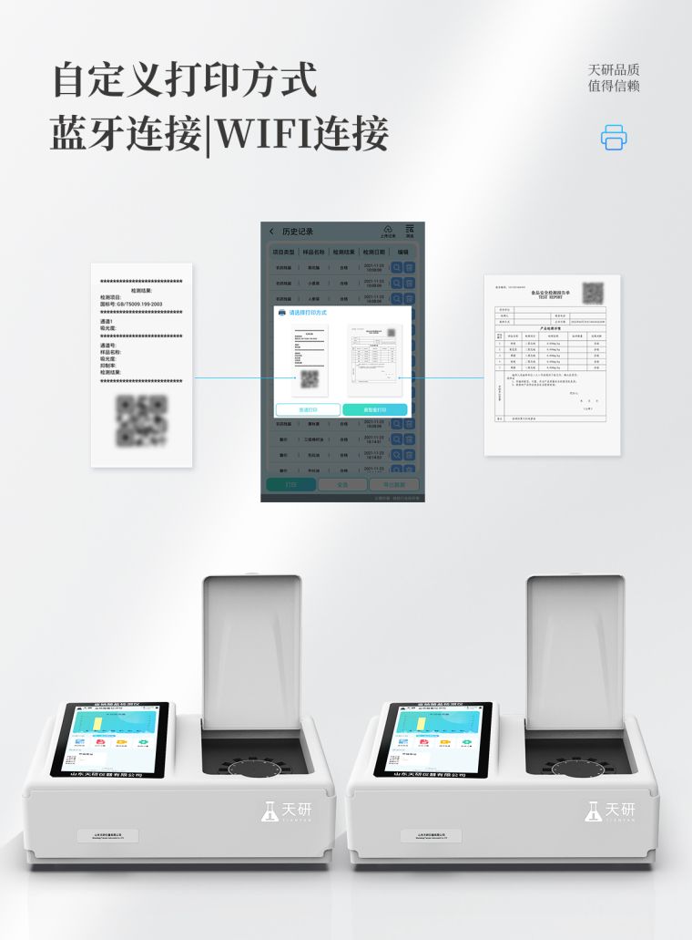仪器采用台式一体化系统检测技术,将分光光度模块、数字化管理模块、无线通讯模块高度集成于一体,可支持检测60种食品安全检测项目,同时预留升级检测方法。
