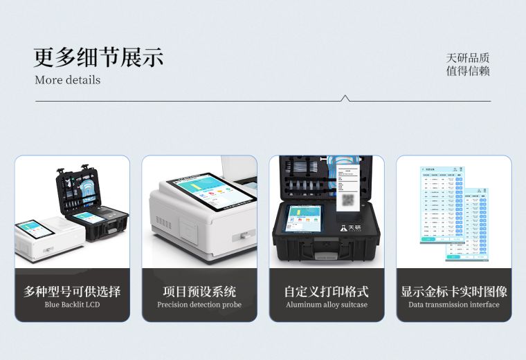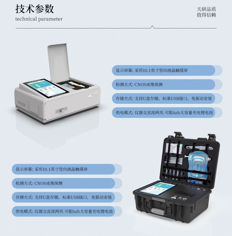 一体化便携式快检设备,采用交直流两用供电方式,可连接车载电源,配备6ah大容量充电锂电池,可以满足现场及流动检测使用的需求。仪器尺寸:43×35×20cm, 主机净重:5.1kg