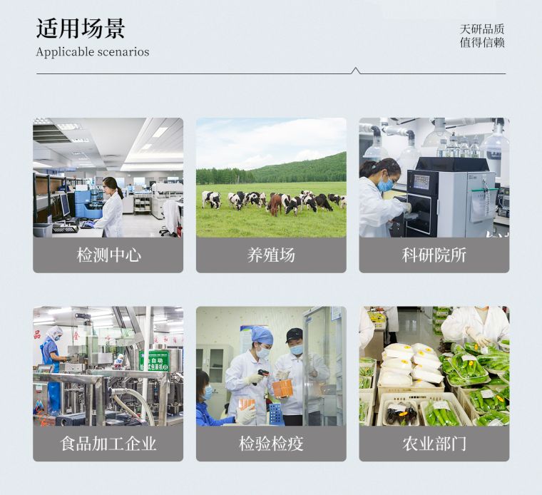 该仪器广泛应用于食药监局、卫生监督部门、农业部门、商业系统养殖场、屠宰场、食品肉产品深加工企业、畜牧兽医、检验检疫部门、食品生产企业、农副产品批发市场、农业生产基地、超市、餐厅、高教院校、食堂等单位部门对食品中的不安全指标进行监测使用。