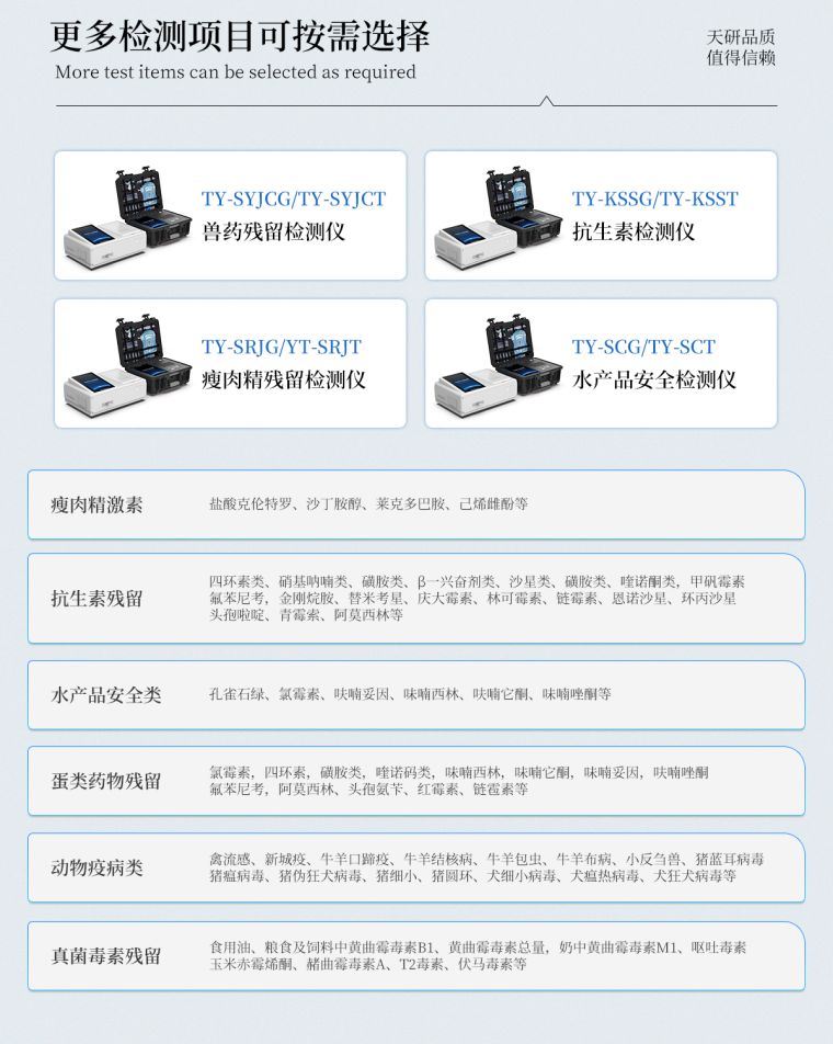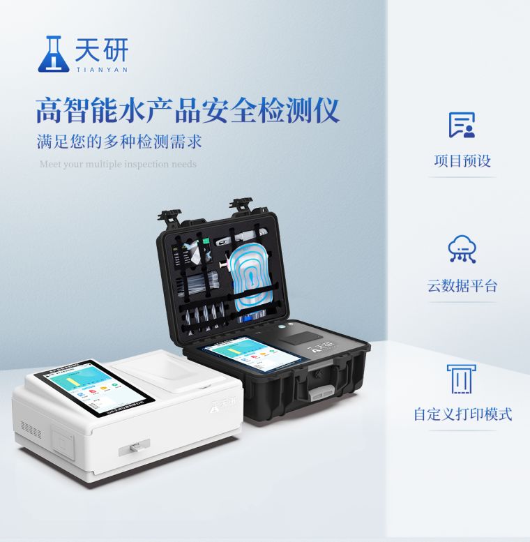 我司生产的水产品安全检测仪可适用于鱼、虾等水产中孔雀石绿、氯霉素、硝基呋喃类:呋喃唑酮(AOZ)、呋喃它酮( AMOZ )、呋喃妥因(AHD)、呋喃西林(SEM)、呋喃那斯、磺胺类、激素类、四环素类、金霉素、土霉素、甲砜霉素、氟苯尼考、喹诺酮类药物:噁喹酸、诺氟沙星、恩诺沙星、环丙沙星、氧氟沙星等药物残留的定性检测