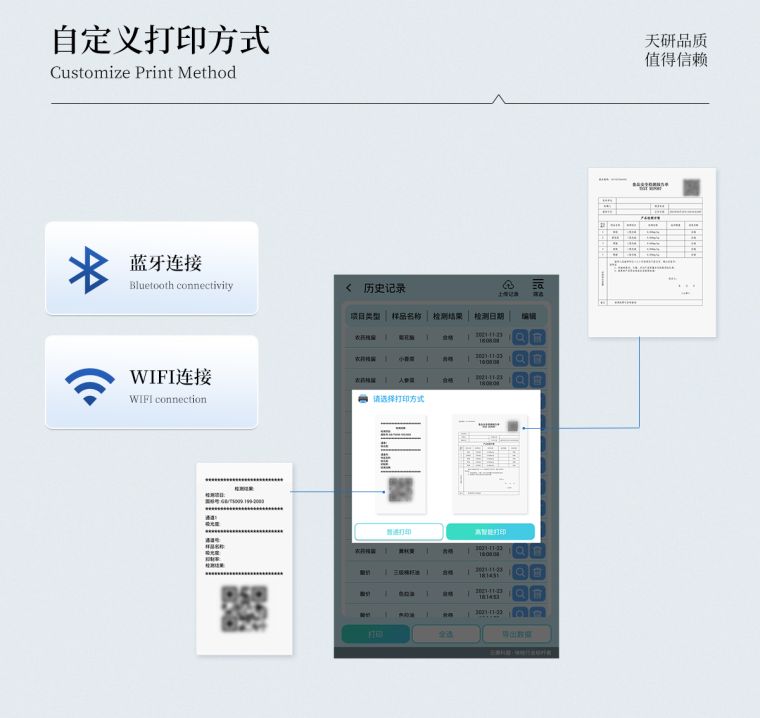 A4纸版本报告打印功能(可选配):设备拥有两种结果展示方式,可以自动生成A4打印模板和小票打印模板两种样式,可通过WiFi及网线等方式链接外置打印机可进行打印