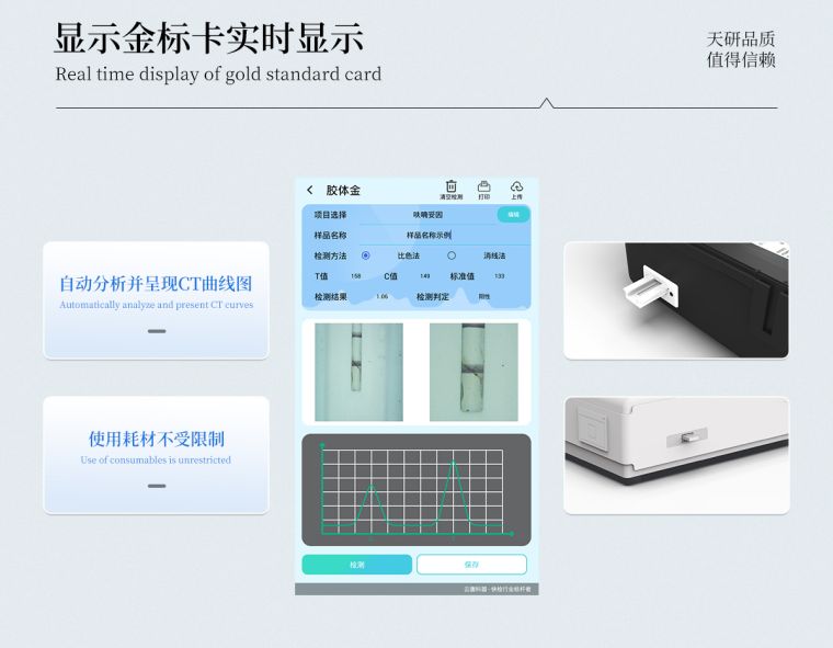 胶体金检测模块:轨道式自动传输扫描方式,可实时显示金标卡实时图像,系统自动分析并呈现出CT曲线图,CT线自动识别,无需手动调整,完成检测后自动退出检测卡。