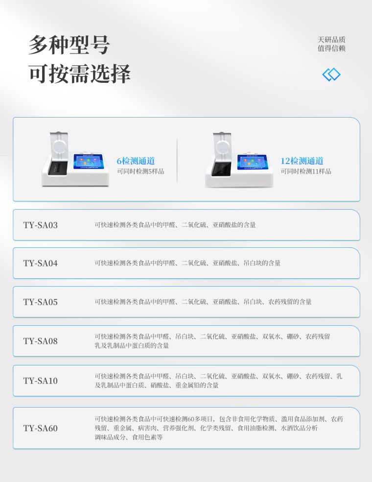 仪器采用台式一体化系统检测技术,将分光光度模块、新型农残检测模块、数字化管理模块、无线通讯模块高度集成于一体,支持检测200种食品安全检测项目,同时预留升级检测方法。