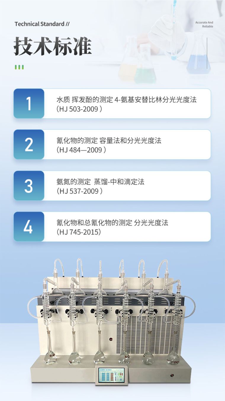 该仪器实验了控温、自动防倒吸、加热均匀、防止暴沸、智能终点控制等功能。使用方便,节能环保。经过实验室蒸馏回收率比对验证,结果准确,回收率达95%以上。该仪器可广泛适用于环保、疾控、水产、供排水、高校、科研院所、厂矿企业等各类化学实验室需要蒸馏处理的场所,如挥发酚、氨氮、凯氏氮油中水分等项目的蒸馏处理。